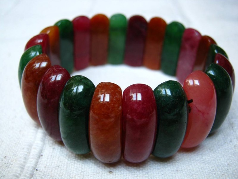 Roztažitelný náramek je tvořen 22 tyčinkami barveného achátu, každá velikosti 10 x 25 mm, vnitřní obvod celého náramku 19,8 cm. Dílky jsou spojeny pružnou gumičkou.