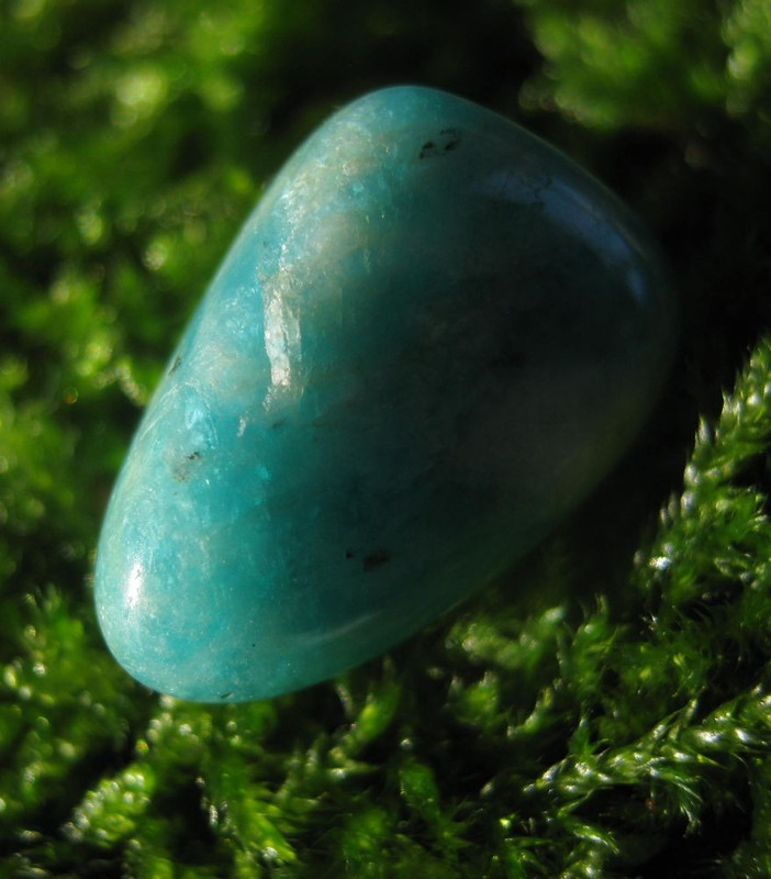 1,3 g, 1,7 cm. Amazonit tiší nervový systém - doporučuje se na zklidnění nervů při emotivních poruchách, léčí nervovou vyčerpanost. Zmenšuje obavy a strach. Tlumí bolesti hlavy a migrény. S jeho pomocí se lépe zbavujeme egoismu a lpění na věcech. Posiluje srdeční činnost, podporuje řeč a tedy napomáhá výraznosti projevu. Léčí osteoporózu, zubní kazy, přináší úlevu při svalových křečích.Zvyšuje tzv. "ženský princip - JIN", přináší vytrvalost a trpělivost. Pohlcuje také škodlivé záření z mobilních telefonů.