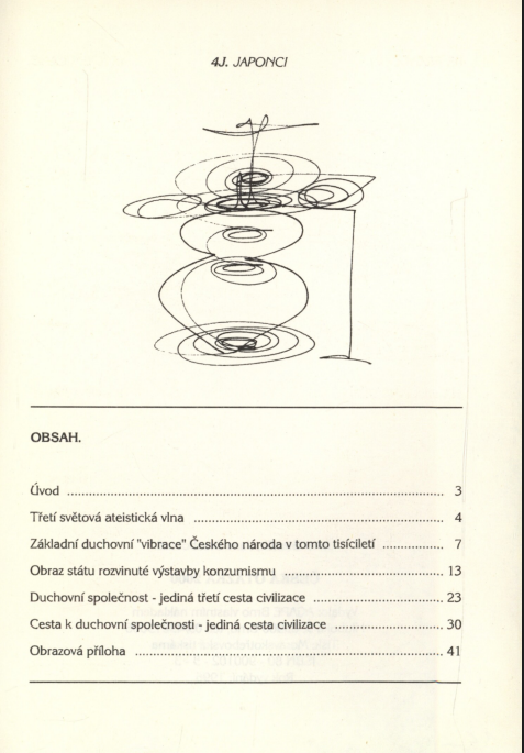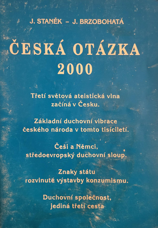 Češi na prahu třetího tisíciletí. Alternativní a duchovní pohled. Smysl existence národů, jejich vývoj a perspektivu, je schopen pochopit a vysvětlit jedině duchovní přístup. V něm je kromě rozumového pohledu obsažen i aspekt intuitivní a duchovní. Tento úhel pohledu se opírá o poznání mechanismů zákonů věčnosti, tj. božích mlýnů. Ateisty ovládaná tzv. společensko-vědní oblast však tento přístup odmítá jako nevědecký. Proto jsme v situaci, že se celý národ a civilizace zmítá v krizi, ale jejich pseudoelity jim nejsou schopny nastínit pozitivní program bytí. Tito společensko-vědní "bádalíci" jsou schopni národům předložit pouze řečnická rozumářská cvičení a slohové ekvilibristiky. Pro ty lidi, pro které je existence národů samozřejmostí a chtějí se zamýšlet nad takovými "zbytečnostmi", jako je smysl naší národní existence, její perspektiva, vztah k německým sousedům, existencí třetí cesty civilizace, přichází autoři s touto relativně malou publikací, která dává pohled na vývoj společnosti jako celku ve dvou rovinách – konzumní a duchovní.