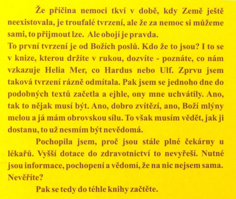 To první tvrzení je od Božích poslů. Kdo že to jsou? I to se v knize, kterou můžete držet v rukou dozvíte - poznáte, co nám vzkazuje Helia Mer, co Hardus nebo Ulf. Zprvu jsem taková tvrzení rázně odmítala. Pak jsem se jednoho dne do podobných textů začetla a ony mne uchvátily. Ano, tak to nějak musí být. Ano, dobro zvítězí, ano Boží mlýny melou a já mám obrovskou sílu. To však musím vědět, jak ji dostanu, to už nesmím být nevědomá.