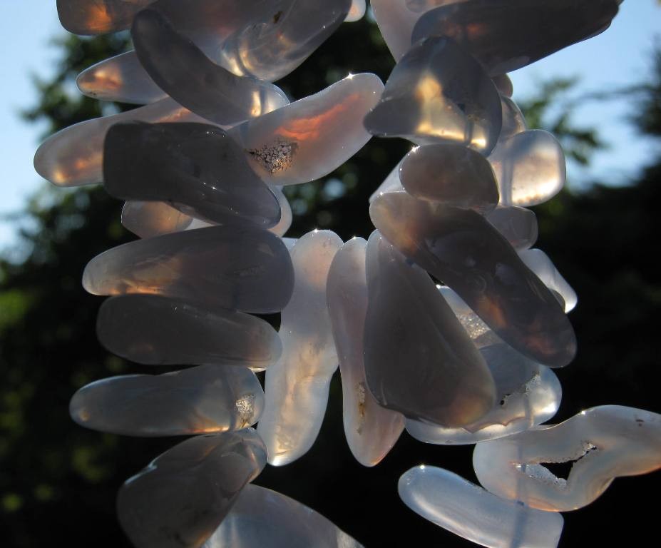 Valounky příčně na plátky řezané, leštěné, provrtané. 44 + 8cm prodlužovací řetzžek. Pro činnost štítné žlázy. Léčí nemoci krku a hltanu. Chladivý a zklidňující - chalcedonový řetěz v létě způsobí, že se méně potíme a nemáme žízeň. Brání hněvu, zastavuje krvácení.