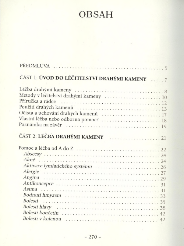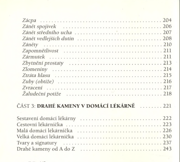 Léčení drahými kameny je již pevnou součástí přírodního léčitelství. Tato publikace se zaměřuje na nejpraktičtější stránky tohoto delikátního umění a přináší souhrnné informace o 132 nejběžnějších onemocněních, u nichž se prokázal terapeutických vliv drahých kamenů. Naučíte se, jak jednotlivé kameny pročišťovat, přikládat na postižená místa, jak je nosit na těle, jak jimi pohybovat při masáži nebo jak z jejich vnitřních sil vyrábět energetické esence. Důležité informace se týkají rovněž vztahu alternativních způsobů léčby a odborné lékařské péče.