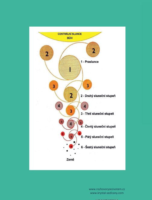 Str. 15 "Ukázala jsem mamince obrázek šesti slunečních stupňů až po centrální Slunce, kde sídlí Bůh. Více podrobností jsem jí neříkala, to by na ni bylo moc. Ale toto ji velmi oslovilo, protože si dokázala představit prostorově, kde je (planeta Země) a kam směřuje. Potom jsem ji přečetla několik skutečných příběhů z krásné knihy od Adelmy Vay "Život v astrálních sférách Země" a také příběh Gisely Weidner, její životní příběh zemřelé dcery, jak se paní Weidner dostala k psaní nádherných knih, a odkud a jak přicházejí informace "shůry". Velmi ji dojaly skutečné příběhy lidí."