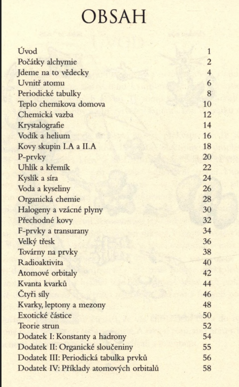 Z čeho skládá hmota kolem nás a kde se vzala? Jaká tajemství se skrývají v laboratořích novodobých alchymistů? Má hmota nějaký řád a dokážeme jej někdy zcela pochopit? Kniha doposud nejmenším vydaným průvodcem základními stavebními jednotkami celého vesmíru. Dočtete se o dějinách alchymie a vzniku moderní chemie, o látkách dobře známých, jako je úhelník, kyslík či voda, ale také o prvních vzácných zemin, transuranech nebo subatomárních částicích.