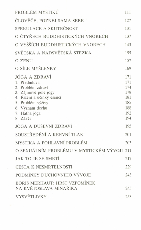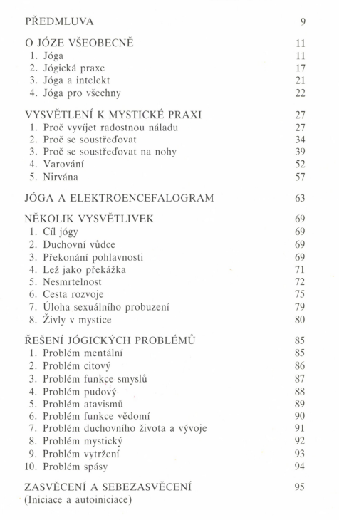 Úvodní práce nejprve vysvětlují, jaký smysl vlastně má jóga a jaké má místo v každodenním životě normálního občana, jak pomáhá řešit životní problémy. Značnou pozornost věnuje způsobu soustředění, varuje před jeho nesprávným pochopením a v práci, jejímž spoluautorem je doc. MUDr. Antonín Bajer, podává důkazy o činnosti mozku při různých typech jógického soustřeďování. Několik prací se dále zabývá různými filozofickými a duchovními směry, jež jsou dnes znovu aktuální, jako je buddhismus a zenbuddhismus.