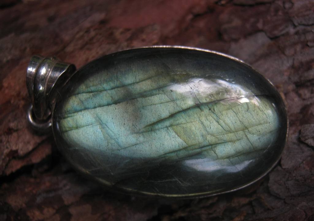 13 g, 35 x 23 x 6 mm. Labradorit, kámen intuice, meditace a aury, pomáhá objevovat pod šedou každodenností kreativitu, na krku podporuje přesné vyjadřování. Odstraňuje staré nemoci a bloky, zvyšuje pozornost. Podporuje uzdravování a celkovou regeneraci.