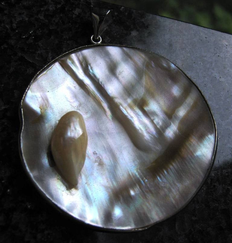 Průměr 5,2 cm. Obroušená lastura vsazená do rámečku se skrytou perlou.