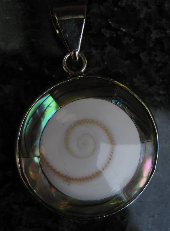 Průměr 2,5 cm, obvod vykládáný mušlí Black lip. Nosí v sobě vibrace a sílu moře. Na čakře hrdla pomáhá při zánětu dýchacích cest, celkově vlivem vápníku posluje kosti, zuby, nehty. Nabíjíme na slunci.