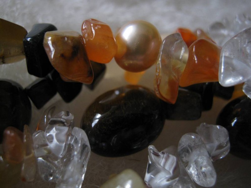 152 cm. Tygří oko, křišťál, karneol, perla. Pomáhá zpracovat citový balast, vyjasňuje pocity a záporné emoce a tím fyzickou očistu a vylučování.. Vhodná při nedostatku kalcia. Také napomáhá imunitnímu systému těla, zajišťuje jeho odolnost a posiluje nervy. Perla podporuje uzdravující proces u psychosomatických nemocí, na čele posiluje nervy a intuici, tiší bolesti a mírní horečky, na krku pomáhá při zánětu dýchacích cest, na břiše reguluje funkci sleziny a střevního traktu.
