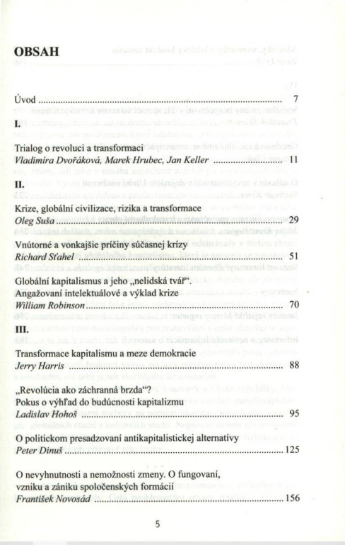 Český a slovenský text, anglické resumé. Příležitost znovu reflektovat pojmy revoluce a transformace. Kniha přibližuje téma postupných i rychlých, zásadních i povrchních, dramatických i plynulých sociálních změn v posledním období a ukazuje možné budoucí vývojové trajektorie. Obsahuje transdisciplinární rozbory na pomezí filosofie, politologie, sociologie, globálních a kulturních studií.