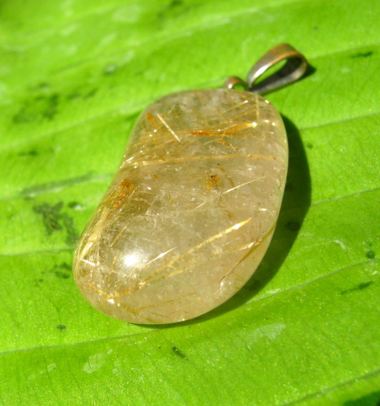 2,3 x 1,3 x 0,8 cm. Křišťál s vrostlicemi rutilu, oxidu titaničitého. Není to jen jemné záření zlatých vrostlic, čím rutil křišťál obohacuje. Podstatná je jeho vlastnost, která posiluje přenos energie a tím pozitivně harmonizuje jakékoli místo na těle a reguluje zdravý růst a vlastnosti buněk. Zmírňuje potíže srdeční, potíže dýchacího ústrojí, zejména astma, bronchitidu a tuberkulózaü, posilňuje funkci štítné žlázy.