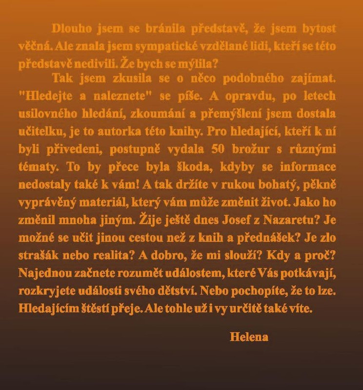 Potěšila mne její reakce: "Teprve teď jsem si s plnou silou uvědomila, že jsme sice vesmír svobodné volby, ale u nás, na Zemi, jsme vlastně loutkami. Však již Komenský napsal Všichni na jednom jevišti světa. Jsme loutkami do té doby, než si uvědomíme, jak to vlastně všechno funguje. Bolestně najednou vnímám tu polovičatost zdejšího lidského materiálního poznání. Já, absolventka University Karlovy, vím toho o životě jen polovinu. Protože nežiji-li jako samostatná bytost, ale jako ovládaná loutka - to se mi nelíbí, to se mi opravdu nelíbí.