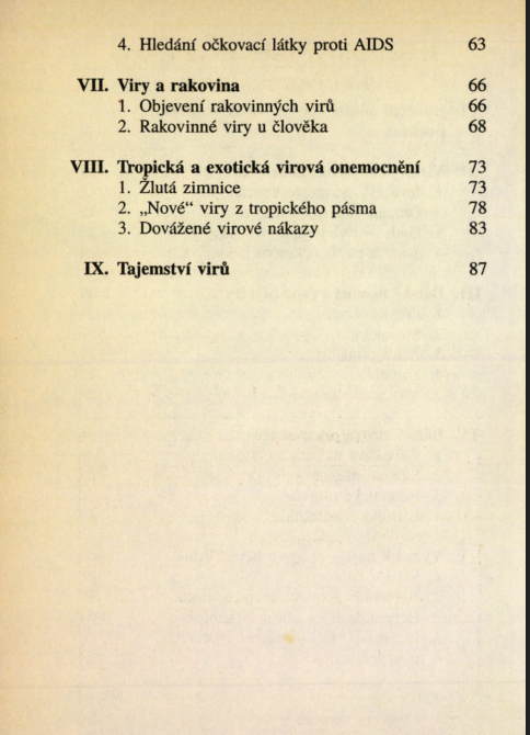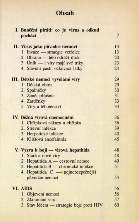 Kniha je určena pro laiky a velmi stručně informuje o tom, co viry jsou, jaká je jejich stavba a životní projevy, o jejich zařazení do systému, o tom, jak vznikají, jak se přenášejí a jakými metodami prevence a léčby se jim můžeme vyhnout. Základní informace o virech a nemocech, které způsobují.