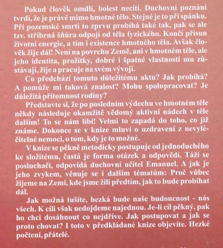 Představte si, že po posledním výdechu ve hmotném těle následuje okamžitě nádech v těle dalším! To se mi líbí! Velmi to zapadá do toho, co již znám. Dokonce se v knize mluví o uzdravení z nevyléčitelné nemoci, o tom, kdy je to možné.